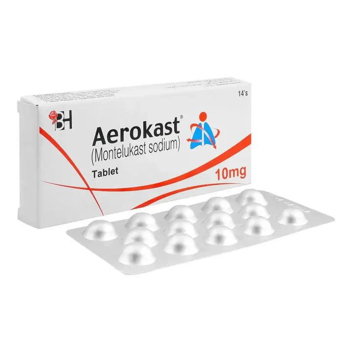 Aerokast 10mg Tablet contains montelukast sodium which is used to help control allergy symptoms and prevent asthma attacks. It is commonly prescribed in Pakistan for patients suffering from allergic rhinitis, breathing difficulty, wheezing, and seasonal allergies. This medicine helps reduce airway inflammation, improves breathing comfort, and supports long-term allergy and asthma management when taken regularly as advised by a doctor. Aerokast 10mg Tablet is available at Oxygen Pharmacy with assured authenticity and proper storage standards.